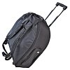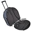 Два внутренних вкладыша для тарелок, 3 наружных кармана, ручки, ремень, можно носить как рюкзак, жёсткое дно с тезой и ножками, оснащён колёсами и выдвижной ручкой.