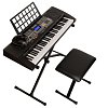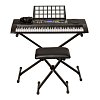 Компактный синтезатор c подсветкой клавиатуры и комплектом аксессуаров: клавишной стойкой, банкеткой, наушниками и кабелем для подключения к компьютеру.